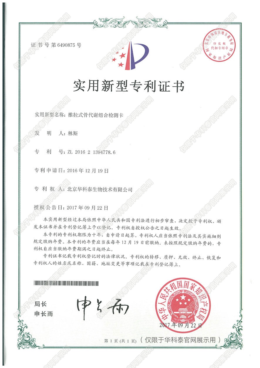 实用新型专利证书- 诊断早期急性心肌梗塞 标志物的联合检测卡